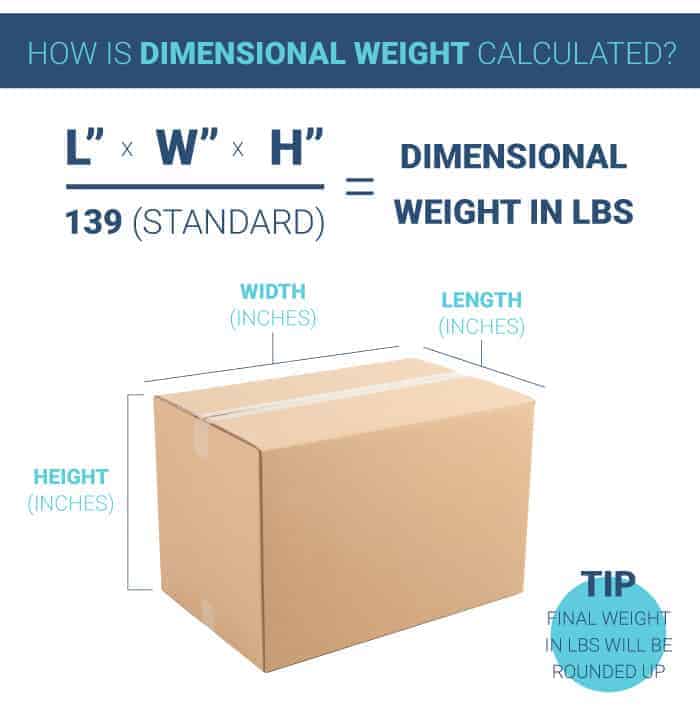 For example: your package is 12″ x 12″ x 12″ and the actual weight is 7 pounds. To calculate dimensional weight you multiply 12 x 12 x 12 to get 1,728 cubic inches. Then you divide that by the standard dimensional factor of 139 to get 12.4 pounds, or 13 pounds rounded up. The shipping charges will be based on 13 pounds as that is larger than the actual weight of 7 pounds.